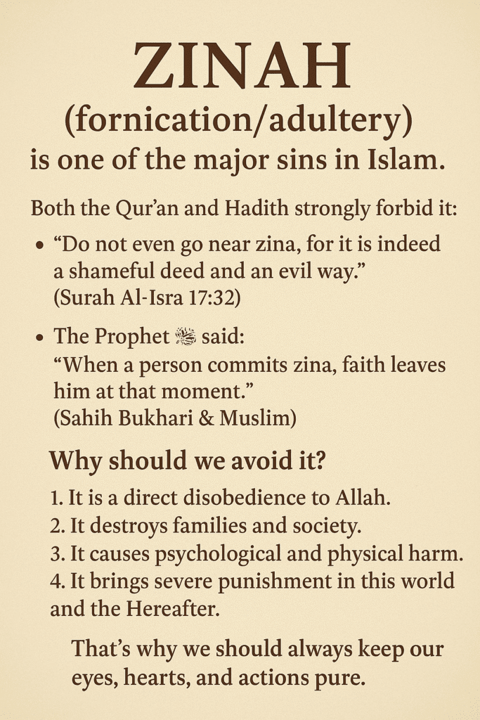 👉 That’s why we should always keep our eyes, hearts, and actions pure.Would you like me to share some practical tips on how to avoid zina?